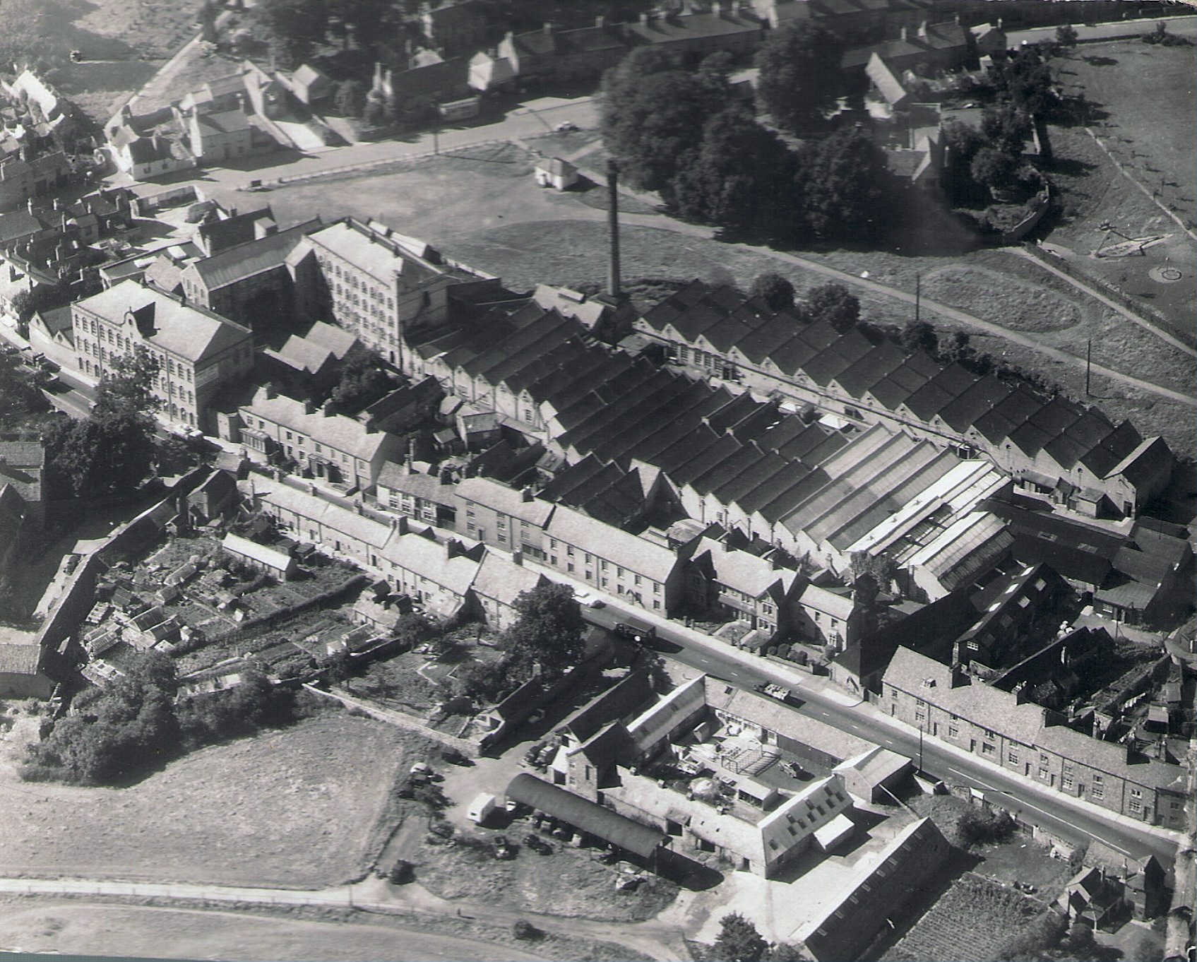 Factory chimney demolished; site redeveloped while manufacturing continued.